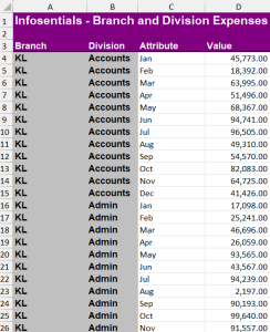 7. You want to make sure that the PURPLE and GRAY colored areas are always visible while you are working with the data, i.e., if you scroll down, the PURPLE area will always be visible, and if you scroll right, the GRAY area will always be visible.